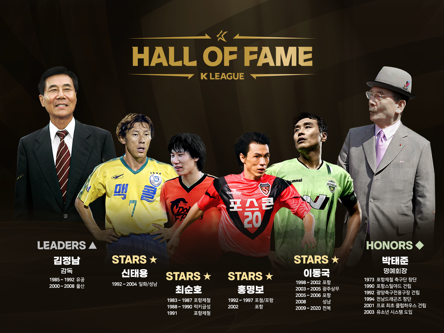 공헌자 부문에는 故 박태준 포스코 명예회장이 이름을 올렸다. 박태준 회장은 1973년 포항제철축구단(현 포항스틸러스) 창단과 1990년 한국 최초 축구전용구장인 포항스틸야드 건립, 1992년 광양축구전용구장 건립과 1994년 전남드래곤즈 창단, 프로축구 첫 클럽하우스 건립, 유소년 시스템 구축 등 한국축구의 질적, 양적 성장에 지대한 공헌을 했다. 연맹은 최초를 두려워하지 않고 최선의 시스템을 강조했던 한국 축구의 선각자 박태준 회장의 업적을 기려 초대 K리그 명예의 전당 공헌자 부문에 헌액하기로 했다.