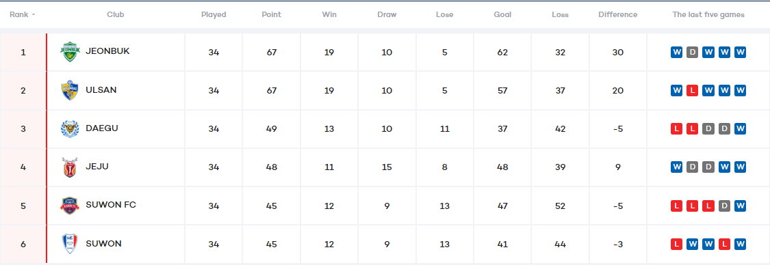 The teams in the top half of the table play out Round 35 this Saturday, starting with Jeju United versus Suwon Samsung Bluewings in the day's earlier kick-off. Jeju hit Daegu FC for five last time out and will be looking to extend their unbeaten run to six. Elsewhere, a potential title decider sees Jeonbuk Hyundai Motors host Ulsan Hyundai after Suwon FC take on Daegu FC with both teams looking to bounce back from defeats last time out.